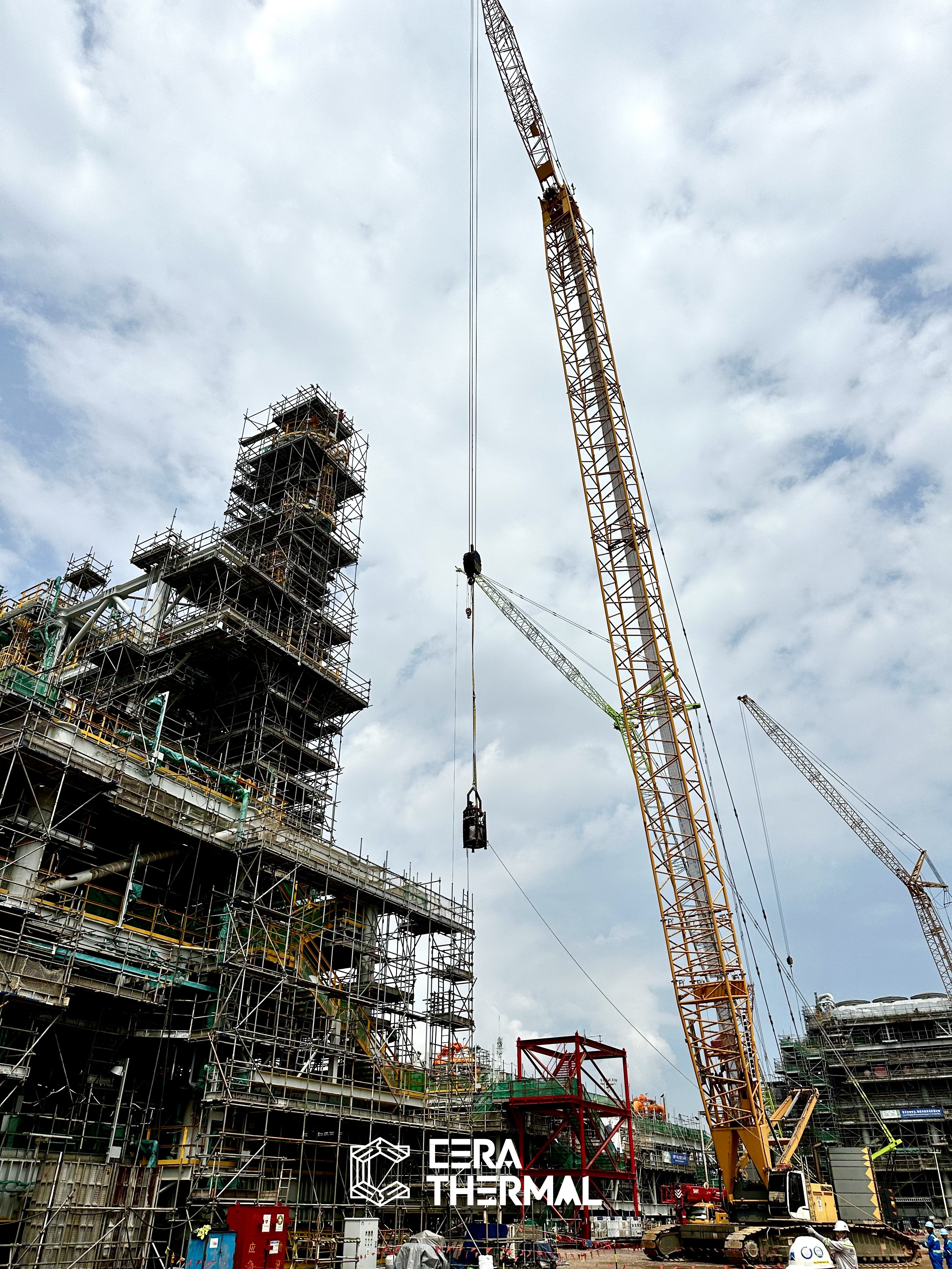 To overcome this unprecedented challenge, the Cera Thermal team creatively adopted a crane and suspended basket system. The suspended basket—carrying workers and equipment—had to meet strict load-bearing and safety standards while being accurately lowered from over 70 meters high into the narrow stack opening, then positioned precisely 25–30 meters below at the repair point. This high-precision aerial operation was a first in the industry.