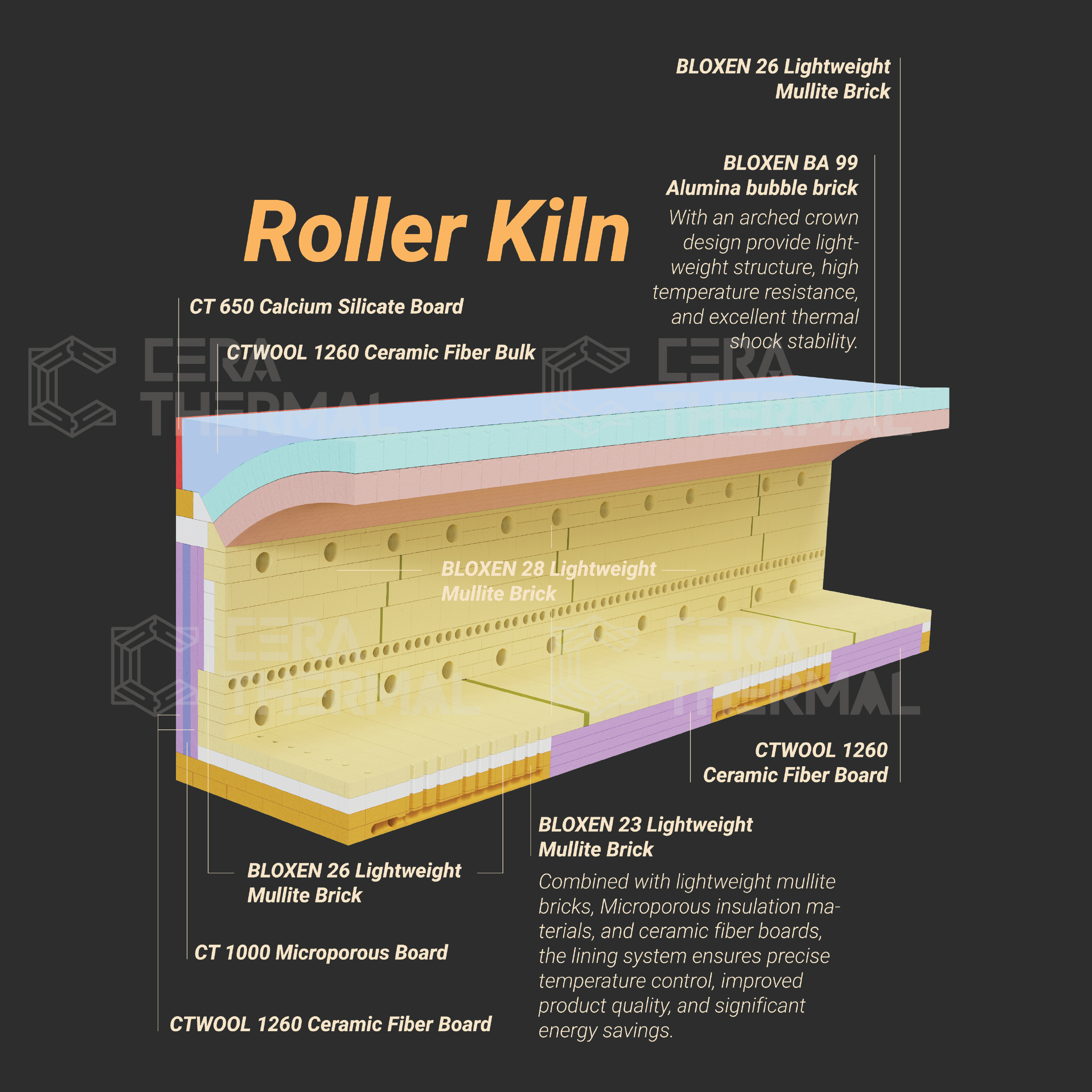 For other sections, the use of BLOXEN 23 Lightweight Mullite Brick, CT 1000 Microporous Board, and CTWOOL Ceramic Fiber Board ensures strong resistance to chemical corrosion and superior thermal insulation performance. This enables precise temperature control within the furnace, ensures consistent product quality, and significantly reduces overall energy consumption.